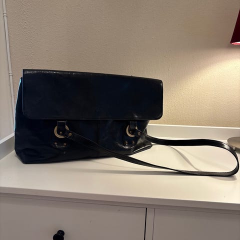 The Monte skulderveske i brunt lær. Synlig brukt, med flekker på foret og merker utenpå, men ingen mangler og den fungerer som den skal. Mulig å feste på koffertstang (se bilde). 40cm x 30cm.