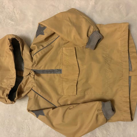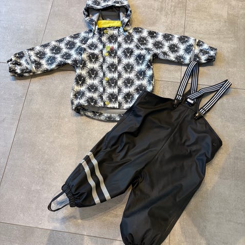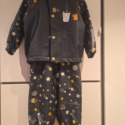 Kattnakken regnjakke str. 80-86 (stor i størrelsen, holdt godt frem til 92+). Lett fôret. Lys blågrå med edderkopptrykk. Den er hel og uten hull, men er litt skjoldete siden fargen er så lys, så den fremstår ikke plettfritt vasket.