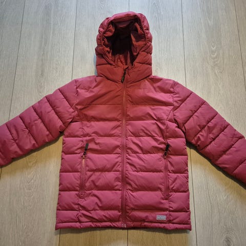 Reflex dunjakke for barn i størrelse 140. Jakken er blå og har et quiltet mønster med horisontale sømmer. Den er fylt med dun og har glidelås i front. Modellen er unisex og passer både gutter og jenter. Egnet som ytterjakke i kjøligere vær. Basert på bildene har jakken ståkrage og elastiske avslutninger ved ermer og nederkant for bedre passform. Har ett lite hull ved ene lomma som er teipet igjen.
