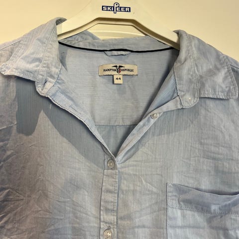 Hampton Republic 27 skjorte for dame i størrelse 44. Skjorten er laget i lett denimstoff i blå farge. Den har lange ermer, krage og knappelukking foran. På brystet er det to påsydde lommer med klaff og knapp. Baksiden har en enkel søm langs midten. Passer til hverdagsbruk og kan brukes både åpen over topp eller lukket som vanlig skjorte.