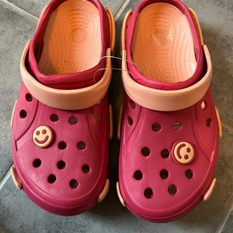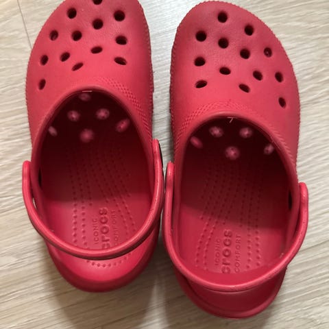 Barnesko clogs i størrelse 29. Skoene er i rød farge med hull på oversiden for ventilasjon og dekorative smilefjes-knapper foran. Skoene mangler hælremmen som kan vippes bak for bedre støtte. Sålen er mønstret for grep, og innersålen har struktur for komfort. Egner seg som lette hverdagssko eller innesko for barn.