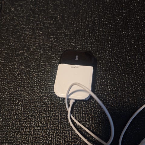 Enheten kobles til strøm via USB-C og brukes sammen med kompatible varmepumper og aircondition-anlegg for styring via app og smartfunksjoner. Undersiden har sklisikre føtter for stabil plassering på bord eller hylle.