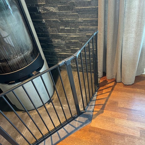 BabyDan sikkerhetsgrind i metall i svart farge. Grind med flere seksjoner som kan brukes som peisgrind eller romdeler for å skjerme områder innendørs. Åpningsbar dørseksjon for enkel passasje. Egnet for bruk i hjem med små barn der man ønsker å avgrense tilgang til enkelte soner.