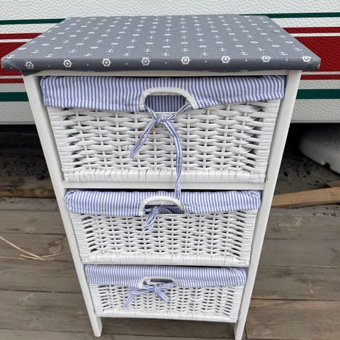 Søt liten kommode med to kurver, som har vært brukt i gangen til å oppbevare votter osv.