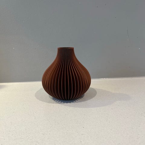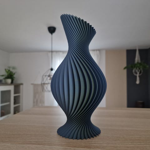 Vase med riflet overflate i svart farge. Vasen har en buet form som er smalere på midten og videre åpning øverst. Egnet til dekorasjon og plassering av kunstige blomster eller tørkede kvister på bord, hylle eller vinduskarm.