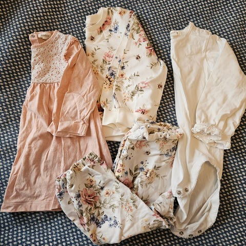 - to fine sommerlige kjoler fra HM str 92 som har vært brukt samtidig med de andre plaggene. Litt misfarging øverst på den hvite, men ikke så synlig.