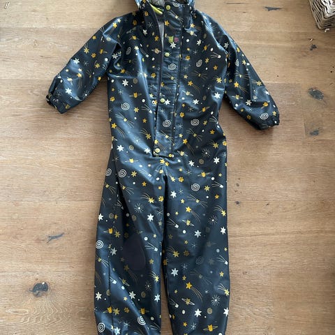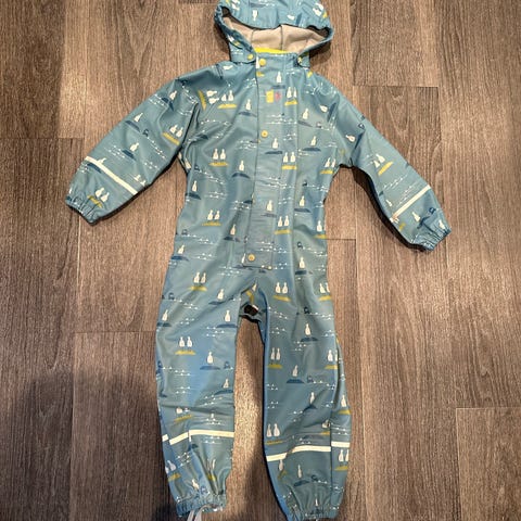 Kattnakken regndress for barn i størrelse 110. Regndressen er blå med mønster og detaljer i kontrastfarge. Materiale i polyester med glatt utside og fôret innside. Modellen har hette, lange ermer og ben med strikk nederst samt fotstropper. Lukkes med glidelås foran og har refleksdetaljer. Unisex-modell som passer både gutter og jenter.