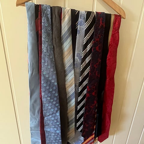 Pakke med herretilbehør bestående av flere slips og sløyfer i ulike farger og mønstre. Bildene viser både ensfargede og mønstrede slips, samt ferdigknyttede og løse sløyfer. Passer til bruk sammen med dress eller skjorte ved formelle og semi‑formelle anledninger. Materiale og eksakte størrelser er ikke spesifisert, men produktene er tilpasset herrebruk.