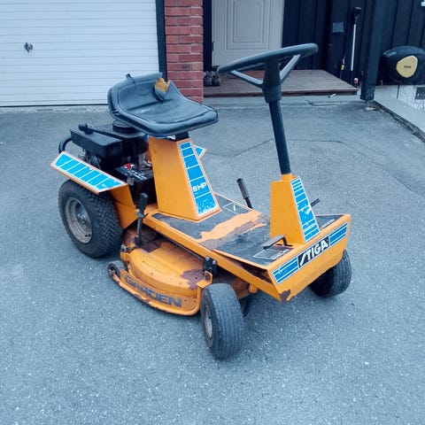 Bensindrevet modell med motor plassert bak setet. Maskinen har fire hjul og førersete med rattstyring. Karosseri i metall med påmonterte plastdeksler.