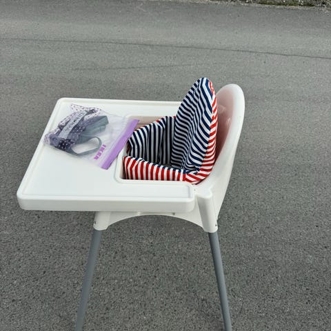 IKEA høy barnestol med brett og stripete pute