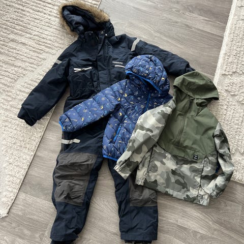Det er 3stykker vinterdress som har størrelse på 110-116. Prisen kan diskutere.