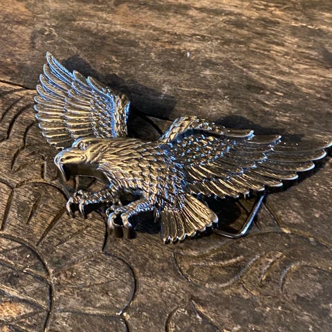 Belte for herre i svart skinn med stor spenne formet som en ørn. Beltet er merket "Fabricado en España" (produsert i Spania). Klassisk skinnreim med justerbare hull og avtakbar spenne festet med trykknapper.