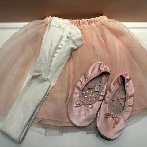 Mørkeblått skjørt 134-140 fra HM, tyllskjørt med strikk i livet, litt gullglitrende effekt og gullglitrende pensko/innesko str 33.
