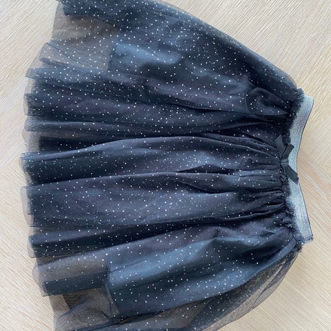 KappAhl skjørt for jente i størrelse 98. Skjørtet er svart og laget i polyester, med flere lag tyll og små prikker som gir et mønster over hele skjørtet. Elastisk linning for bedre passform. Passer til hverdagsbruk og anledninger der man ønsker et enkelt, mørkt skjørt til barn.