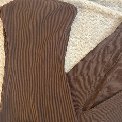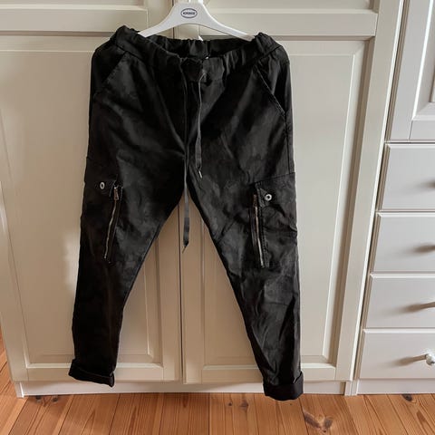 bukse for dame i størrelse XS. Buksen er i brun/beige farge og har et glatt, elastisk stoff som gir en tettsittende passform i livet og rundt lårene. Sleng-bukser, løse ved kneet og nedover. Egnet til hverdagsbruk. Materialinformasjon og vaskeanvisning finnes på lappen i plagget.