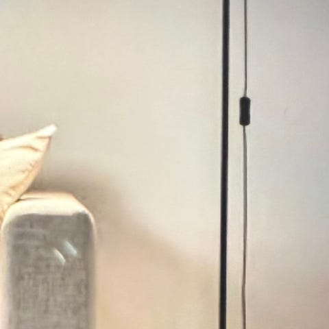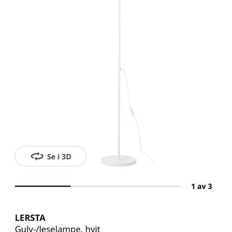 Hvit Ikea gulvlampe med to lamper. En lampe lyser opp i taket. Den andre er en leselampe som kan bøyes. Nederste del av lampeskjermen på leselampen har blitt gul. Foten har noen bruksmerker.