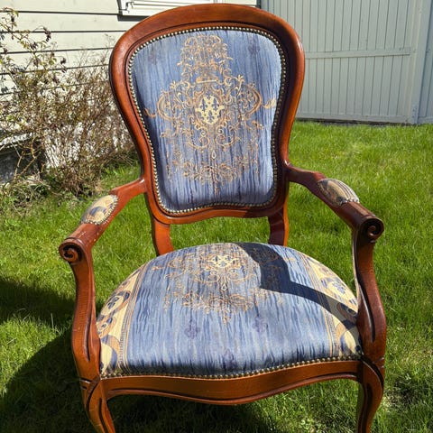 Tung , stødig «barokk» stol . Solid bygd . Sølvfarget maling , noe flasset av , fløyelsvelourtrekk , noe falmet etter rens . Slitasjen har ikke påvirket noe annet enn utseendet, den er veldig god å sitte i , med fast stoppet sittepute . Sittehøyde er ca. 50 cm.