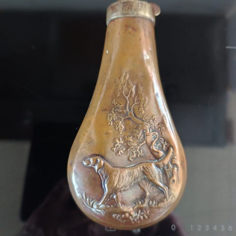 Beholder som ble brukt av lamaer for helbredelse og enten inneholdt medisinsk pulver eller "hellige piller". Guru Rinpoche er avbildet på begge sider i jak-ben. Høyde 17 cm, vekt 250 gram, tibetansk sølv med stener, plombert i bunnen (inneholder hellig gjenstand). Alder ukjent, men med tanke på utførelse og bruksspor meget gammel. Unik sak.