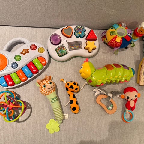 Krabbe og læreball fra Extra leker er ikke brukt. Ellers må det byttes batteri på gitaren.