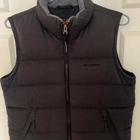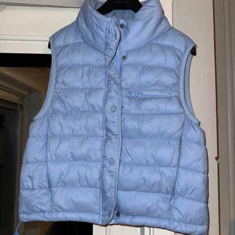 Unisex. Pent brukt dun vest . Men har noen små flekker, lite synlige. Materilae : 55% polyester ,45% resirkulert polyester. Filling: 80% dun, 20% fjær.