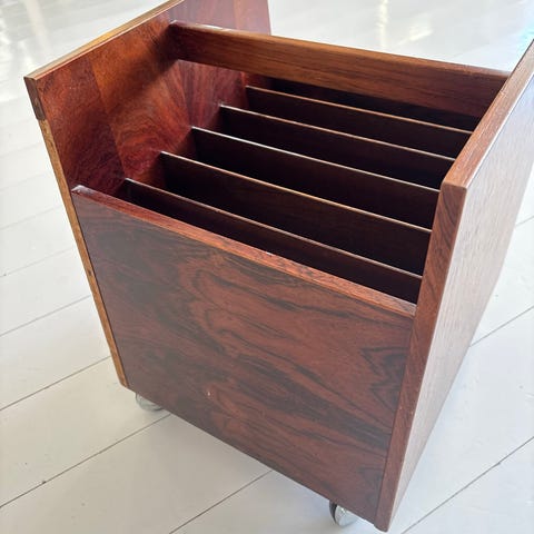 Aviskurv papirkurv oval fra P.S Heggen i palisander. God tilstand utvendig. Kun små avskallinger en side i kant.