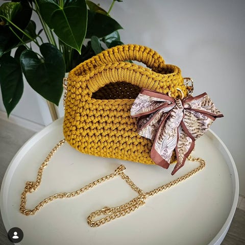👜 Dekorert med kjede i gullfarget metall (veskefeste) og elegant skjerf på håndtaket