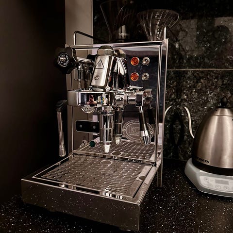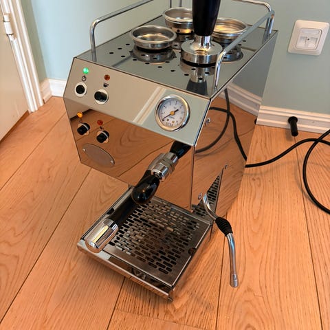 ECM Mechanika (ikke Rocket) espressomaskin i kromutførelse. Maskinen har klassisk E61-bryggehode, trykkmålere i front og separat damparm og varmtvannsuttak. Chassiset er i rustfritt stål med dryppbrett og koppvarmer på toppen. Leveres med portafilter og tilbehør som vist på bildene. Egnet for tilberedning av espresso og melkebaserte kaffedrikker hjemme eller på mindre kontorer.