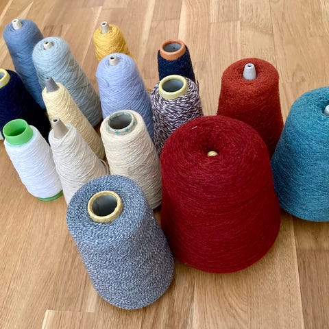 Garn på spole i blå, grønn og beige farge. Tynt garn som egner seg til maskinstrikk, veving eller annen tekstilproduksjon der garn på store spoler er praktisk. Selges som hele spoler slik de vises på bildene. Eller kan selger en og en. Pris er per stk. se pris under hver bilde