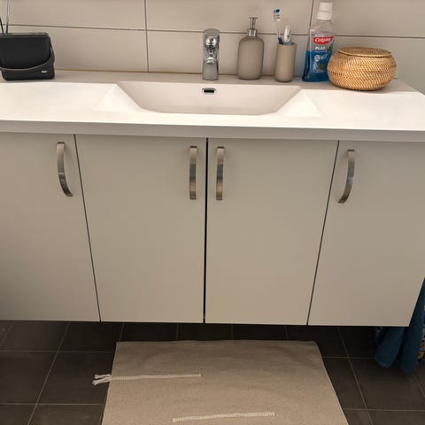 Baderomsinnredning med servant mørk tredekor og hvit topp