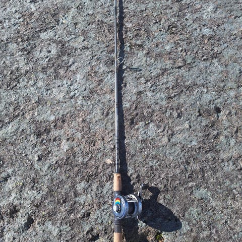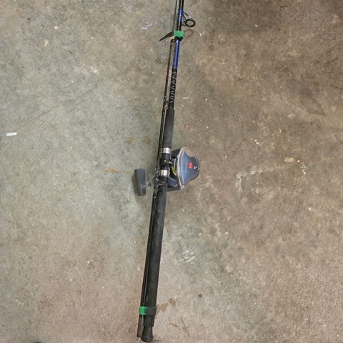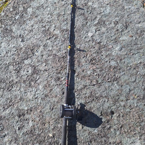 Snellen er en Okuma Solterra multiplikatorsnelle i svart/gull utførelse, egnet for havfiske. Den har sveiv med stort håndtak for godt grep og er montert på stangen.