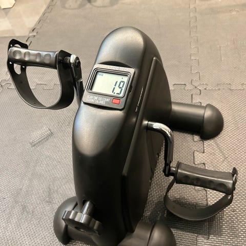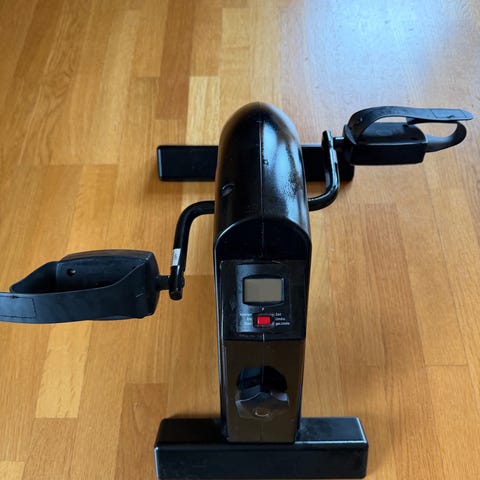 Mini trimsykkel med digitalt display for trening av armer og ben. Enheten plasseres på gulv eller bord og har pedaler med justerbare fotstropper for stabilitet under bruk. Motstanden kan reguleres med dreiehjul i front, slik at belastningen kan tilpasses behov. Displayet viser grunnleggende treningsdata som tid og antall omdreininger. Egnet til lett kondisjons- og sirkulasjonstrening hjemme eller på kontor, samt for enkel rehabilitering og bevegelighetstrening.