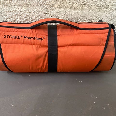 Stokke PramPack trillekoffert for barnevogn i oransje og svart. Transportbaggen er utviklet for å beskytte barnevogner under reise og har polstret innside, flere festepunkter og reimer for å sikre vognen. Yttermaterialet er robust tekstil med hjul og bærestropp for enklere håndtering. Illustrasjoner på innsiden viser hvordan ulike typer vogner kan pakkes ned i bagen. Egnet til oppbevaring og transport av barnevogner på reise, for eksempel med fly, tog eller bil.