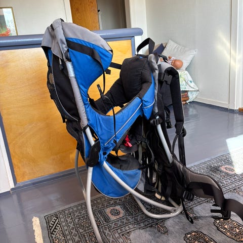 Bæremeis til barn i blå farge. Meisen har polstret sete og rygg for barnet, samt justerbare seler og stropper for bærer. Integrert stativ gjør at meisen kan settes stødig på bakken ved inn- og utlasting av barnet. Egnet til turer og hverdagsbruk der barnet bæres på ryggen.