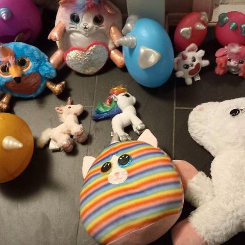 Jentungen selger div Enhjørning leker.