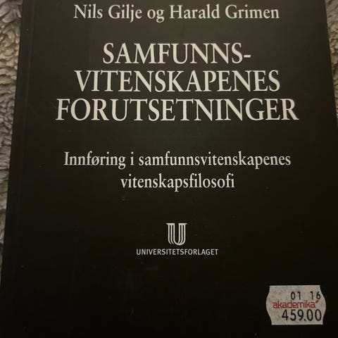 Nils Gilje og Harald Grimen Samfunnsvitenskapenes forutsetninger lærebok i samfunnsfag. Boken gir en innføring i samfunnsvitenskapenes vitenskapsfilosofi og tar for seg grunnleggende forutsetninger for samfunnsvitenskapelig forskning. Egnet som pensumlitteratur eller støttebok i samfunnsfaglige studier på universitets- og høyskolenivå.