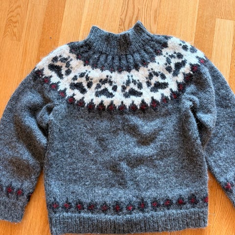 1 stk FØYKA lyngfarger i str M ferdig strikket i kombinasjonen Blåne pelsullgarn fra Hillesvåg og Alafosslopi fra Island.