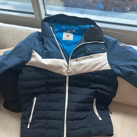 J.Lindeberg skijakke for dame i størrelse L. Jakken har fargeblokk-design i hvitt, blått og orange. Modellen har hette, hel glidelås foran og to glidelåslommer i siden. Innvendig er det snølås med trykknapper og elastisk justering, samt innerlomme med glidelås. Egnet som ytterjakke til ski og annen vinteraktivitet.
