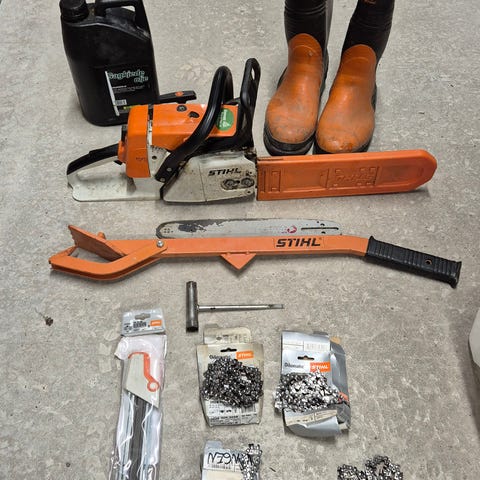 Husqvarna 550 XP motorsag med tilhørende verneutstyr.