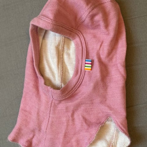 Pent brukt balaklava fra Nøstebarn i 70 % økologisk, ubehandlet merinoull og 30 % silke.