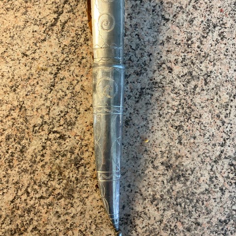 Slirekniv med brunfarget håndtak ku horn Kniven leveres med tilhørende slire i samme materiale- og fargekombinasjon, med beltehempe i lær. Kniv maker er Gulbrand Aleksandersen 1887 /1969 fra Grimstad Han begynte å lage kniver på 50 -talle Han var av reisende slekt , han ble kjent som en flink kniv maker Han brukte ofte kokt kuhorn som på totenknivene Både materiale og holking forteller at han hentet inspirasjon fra Totendistriktet . Selges kr 4000,- + frakt kr 140,- Norgespakke med sporing/ forsikring