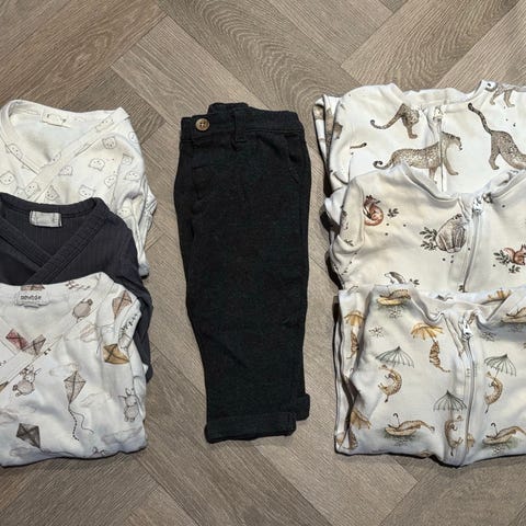 Bodyer er godt brukt og 2 har flekker. Selebukser 68 er som ny.