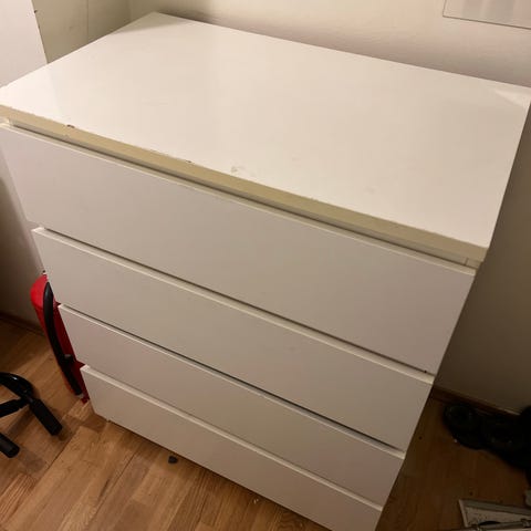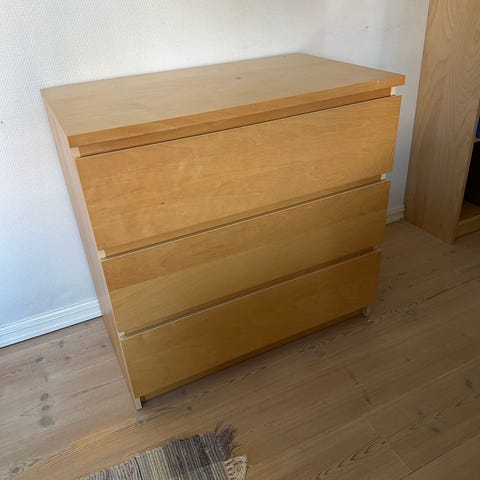 Har også en Malm kommode med tre skuffer til salgs hvis noen er på søk etter et samlet system. Samme utførelse, og målene på denne er B=80, D=48, H= 78 cm. Pris for bare kommoden er kr. 400,-. Denne har også egen annonse, Finnkode 454075854