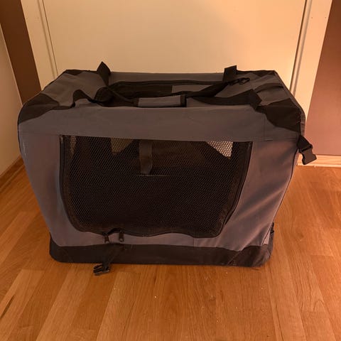 Mykt svart bur i stoff til hund. Baggen har nettingvinduer på sidene for lufting og innsyn, samt åpning foran som kan rulles opp på lang- og kortside. Den har bærehåndtak på toppen for enkel transport og en lys innvendig bunnmatte for økt komfort.