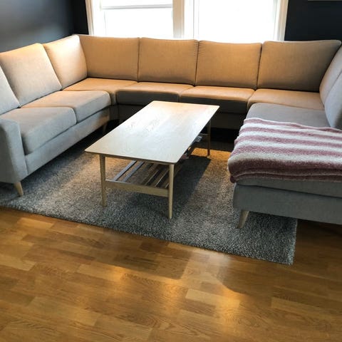 Kjøpt ny på fagmøbler for 53 000. Sofaen er fra 2022. Holder seg fin, men noen flekker har den etter bruk. Mulig det går bort i rens, men er ikke noe som vises spesielt godt i såfall. Noen av føttene på sofaen har litt bruksmerker som kan lakkeres over. Fargen varierer litt i ulike lys.