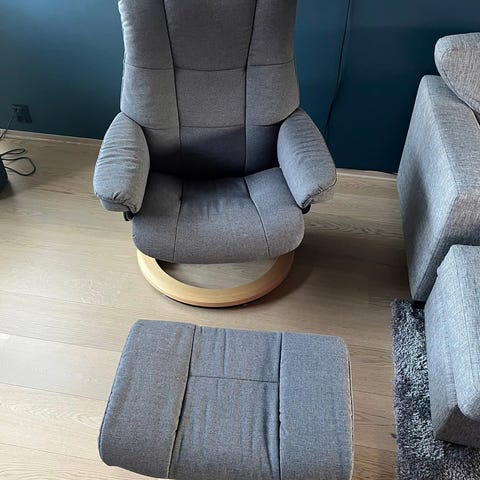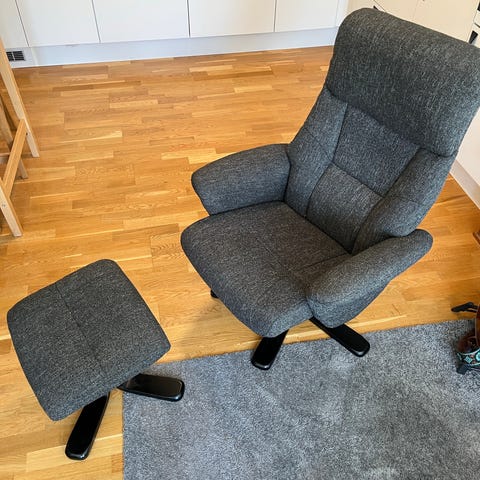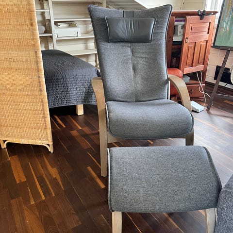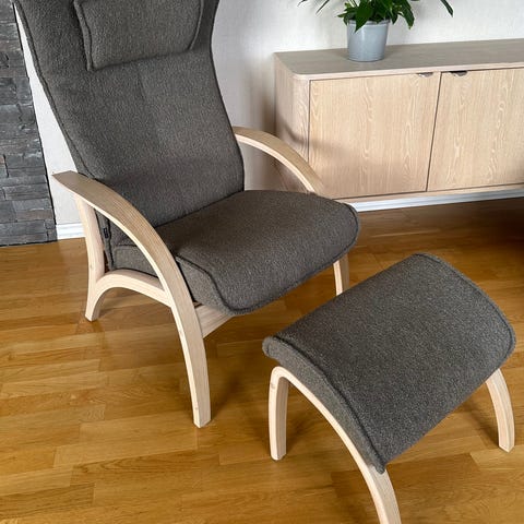 Bohus lenestol med fotskammel i grått tekstiltrekk og lyst treverk. Lenestolen har høy rygg med hode- og korsryggstøtte, polstrede armlener og løse sete- og ryggputer. Fotskammelen har matchende trekk og ben i samme treverk som stolen. Egnet som lesestol eller hvilestol i stue eller andre oppholdsrom.