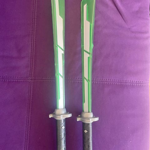 Lyssverd med lyd. Totallengde på sverd, ca 47 cm. Trenger nye batteri. De gamle sitter i og virker såvidt, men trenger nye. Selges samlet for 150kr.