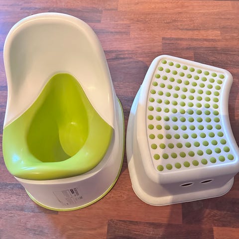 Potte og trappetrinn for barn i grå plast. Potten har høy rygg og sprutkant foran. Trappetrinnet har sklisikker overflate med stjernemønster og sklisikre føtter. Egnet til bruk ved toalett og vask for små barn som trenger ekstra høyde og støtte.grå krakk og grønn potte, blir ikke brukt hos mormor. Hentes evnt sendes mot porto.