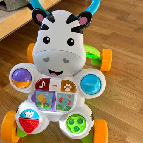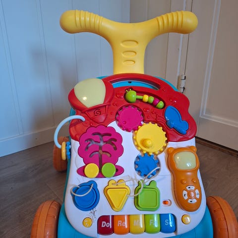Fisher-Price gåvogn aktivitetsleke for barn. Gåvognen har fargerik aktivitetsflate med knapper, rullehjul, hendler og andre elementer som kan trykkes og dreies. Den kan brukes både som støtte ved de første skrittene og som stående aktivitetsleke. Passer for små barn som øver på å stå og gå, og som liker lyd- og sanseleker med sterke farger.