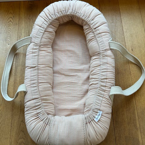 Selger et varsomt brukt babynest fra Liewood. Dette er et helt supert babynest som kan strammes inn slik at det omslutter nyfødte babyer og utvides slik at barnet kan ligge i det i mange måneder. Det har en myk, polstret kant og myk madrass. Håndtakene/bæreselene er ikke godkjent for bæring av nest med baby oppi, og man bør derfor alltid holde en hånd under nestet om man skal bære det med baby i. Under har nestet en plastbunn/avstivet bunn, som gjør at man kan sette det ned på alle overflater uten at det blir klumpete eller vått for baby. Nestet har noen små rifter i trekket, men dette gjør ingenting for funksjonen. Ingen bruksmerker ut over dette. Trekket kan tas av og vaskes i maskin.
