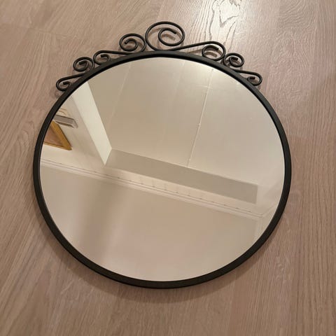 Diameter på 60cm. Kan hentes på tromsøya. Oppheng i rammen slik at speilet ligger helt inntil veggen.